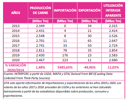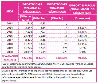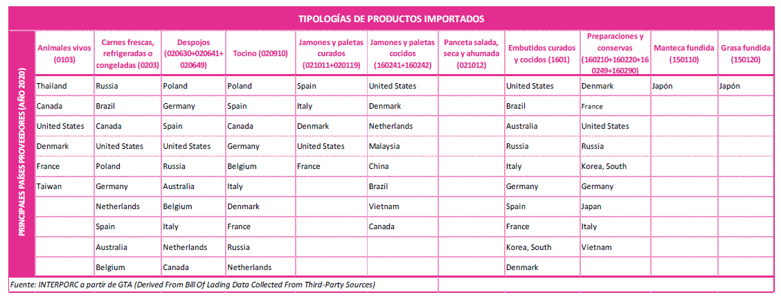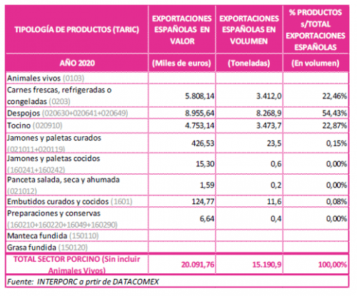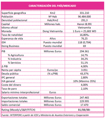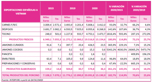 España en 2020 fue el 8º proveedor de porcino de Vietnam, por detrás de Rusia, Brasil, Polonia, Canadá, Alemania y EE.UU. Las exportaciones españolas en dicho año solo representaron el 6,8% de todas las importaciones vietnamitas de carne y elaborados de porcino, alcanzando las 15.190 toneladas (incluyendo 35 tn de elaborados curados y embutidos) por un valor de algo más de 20 millones de euros cifras indicativas de que el sector porcino español tiene potencial productivo y competitivo para superar con creces tales cifras exportadoras y alcanzar una mejor cuota y posición competitiva como proveedor de porcino del mercado vietnamita.