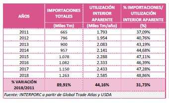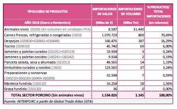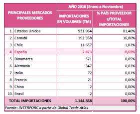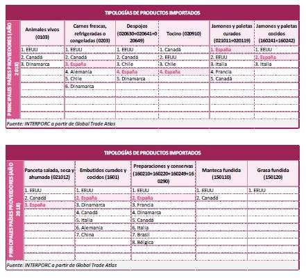 Actualmente EE.UU. y Canadá controlan el 98% de las importaciones de carnes y elaborados de porcino que realiza el mercado mexicano; Chile representa un 1% y le sigue España que representa el 0,70% de dichas importaciones. A su vez, la mayoría de éstas corresponden a carnes y despojos frescos, refrigerados y congelados (más del 87% de las importaciones mexicanas de porcino), mientras que las importaciones de productos curados y embutidos apenas representan un 3,5% y el tocino un 6%.