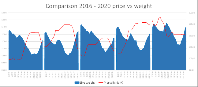 Por otro lado, los precios son más bajos, pero no tanto como en años anteriores. Tanto 2019 como 2020, han sido años atípicos en cuanto a precio, pero la tendencia al aumento de peso es clara.