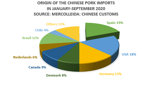 La demanda de lechones está aumentando, típico en esta época del año, pero ahora los lechones deben nacer en España, de lo contrario, no se permiten exportaciones de carne fuera de la UE. Sin excepción, los cerdos deben haber nacido, criado y sacrificado en España para ser exportados. Cabe destacar que España es el primer exportador mundial a China en el período de enero a septiembre de 2020, superando a EE.UU., Brasil o Alemania.