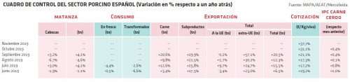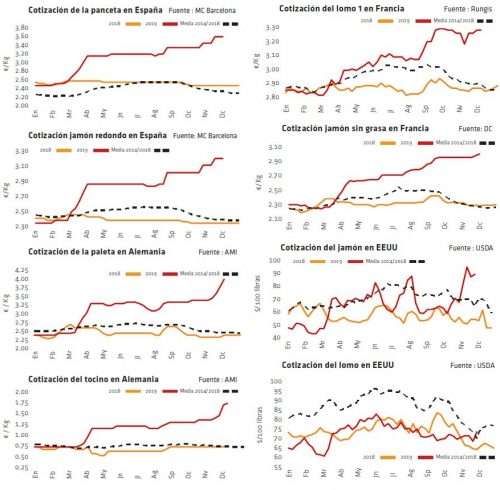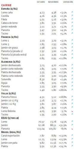 Las cotizaciones han subido en torno a un +4% en España, ya que las ventas para exportación empiezan a limitar las disponibilidades para el mercado interior. En Alemania, las subidas han sido todavía más fuertes, ya que a la sostenida demanda para China se le une una demanda interior más fuerte y, sobre todo, una oferta de cerdos inferior al año pasado, que incrementa la competencia entre mataderos y reduce las producciones. Los jamones han subido en este país en torno a un +10% durante noviembre y las paletas, más del +15%. En cambio, la revalorización en Francia ha sido de menor amplitud: del +2% al +4%, según piezas. Pero todo, cotiza muy por encima del año pasado en este mismo mes.