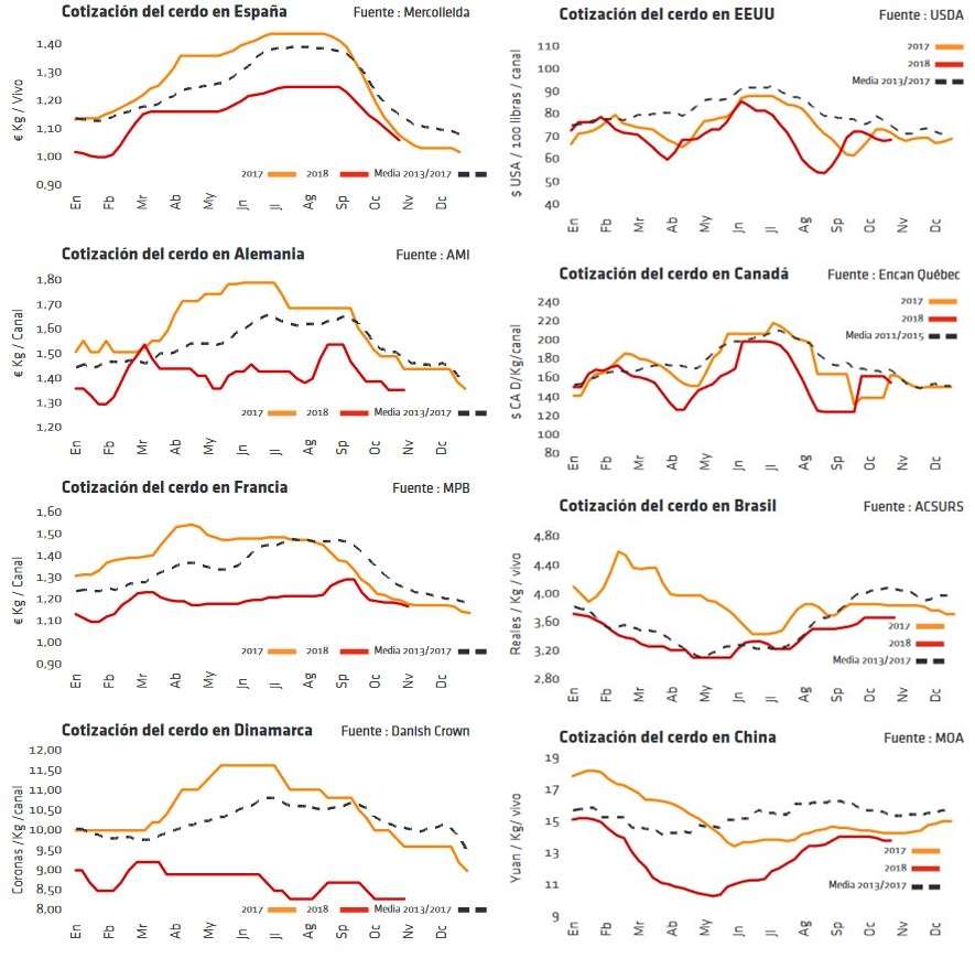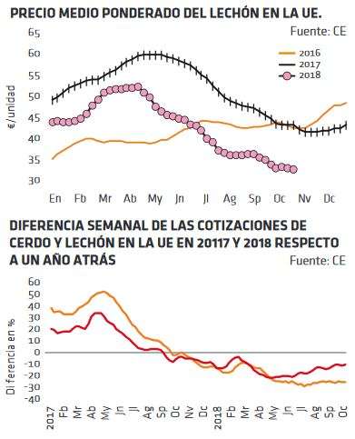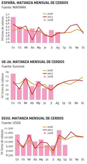 En EEUU, el precio ha vuelto a tocar techo e inició a mediados de octubre una corrección bajista más temprana que otros años. En Chicago, los futuros del cerdo cotizan al alza para 2019, reflejando que la PPA en Europa y China puede beneficiar a los exportadores americanos y que, aunque la oferta de cerdos va a aumentar en EEUU, tal vez no lo haga tanto como se prevé.