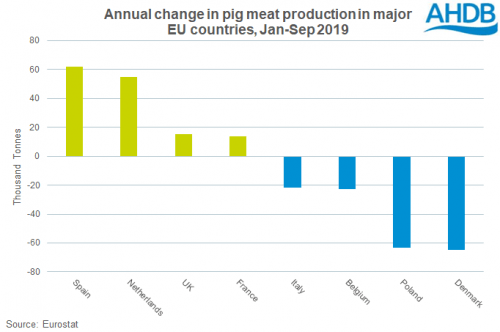 La expansión de la producción en el Reino Unido, en un momento en que la producción general de la UE ha estado cayendo, también ha influido en el comercio durante el año pasado. El rendimiento total ha aumentado en 111.000 cabezas (21.000 toneladas) en base a los primeros 11 meses de 2019. Los pesos de las canales del Reino Unido durante este período han promediado en 84,9kg, un aumento anual de 1,4kg, según Defra datos.