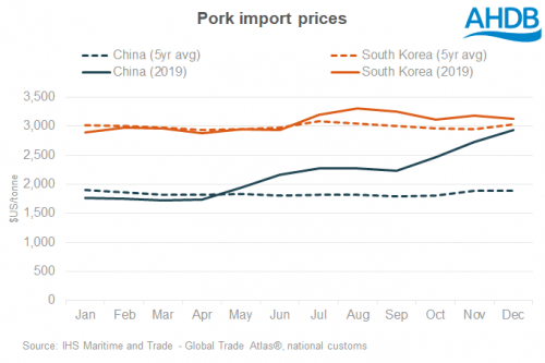 Corea del Sur importó 525.000 toneladas de carne de cerdo fresca y congelada en 2019, un 8% menos que el año anterior, según datos de la Aduana de Corea. Las importaciones de carne de cerdo fueron particularmente altas en 2018, posiblemente en un esfuerzo consciente por crear existencias contra la posible aparción de la Peste Porcina Africana (PPA). Desde entonces, la competencia por la compra de carne de cerdo ha aumentado, particularmente desde China. El crecimiento del consumo también se ha ralentizado, debido a las preocupaciones (infundadas) de los consumidores sobre la PPA.