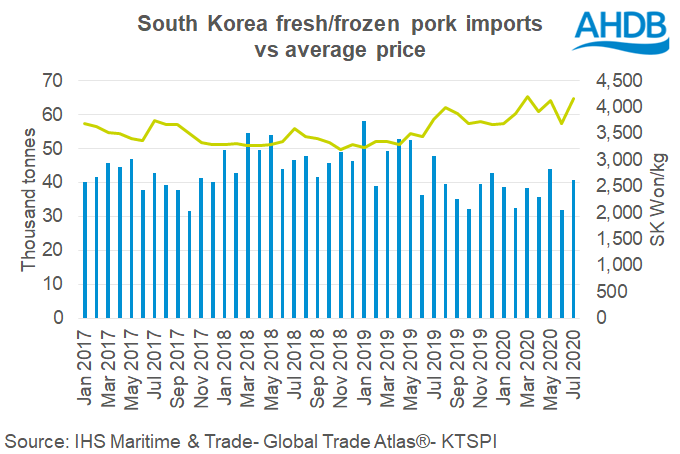 Aunque Corea encontró 14 granjas de cerdos infectadas con Peste Porcina Africana (PPA) en septiembre del pasado año, informan que estos brotes parecen haberse contenido y no se han encontrado más granjas de cerdos infectadas desde octubre de 2019. Los sacrificios porcinos de enero a junio se estimó en una subida del 4% respecto a los niveles del año anterior, según las estimaciones de KMTA. El aumento de la oferta nacional puede haber limitado las importaciones, junto con la interrupción debido a la pandemia del coronavirus y los altos precios mundiales de la carne de cerdo debido al brote de PPA en China.