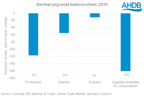La producción alemana de carne de cerdo en 2019 disminuyó aproximadamente en un 2% (-117.000 toneladas) respecto al año anterior. Del mismo modo, la producción de la UE en su conjunto retrocedió un 1%. Esto significaba que los suministros disponibles eran más ajustados.
