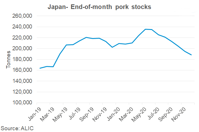 Los niveles de existencias han disminuido desde entonces, y el USDA espera que los niveles de importación de este año aumenten un poco en comparación con 2020. No se cree que el consumo del año pasado haya caído de manera muy significativa en general. El cerdo es un alimento básico de la cocina casera y el crecimiento en esta área se compensa en gran medida con la pérdida de la demanda del servicios de alimentos. Por lo tanto, no se esperan nuevas presiones a la baja sobre los volúmenes de importación. La mayor disponibilidad de carne de cerdo comercializada a nivel mundial, que refleja una menor demanda del mercado chino, también puede alentar la importación si los precios son más favorables.