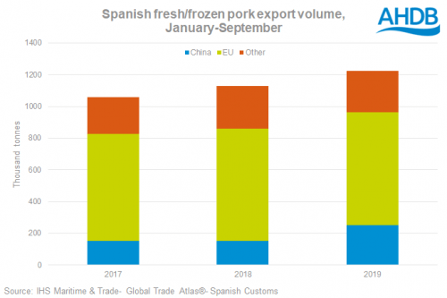 Alrededor del 20% de las exportaciones se destinaron al mercado chino, una participación que se ha expandido notablemente desde el año anterior. Los volúmenes a China aumentaron en dos tercios en comparación con enero-septiembre de 2018. Esto refleja la grave escasez de oferta de China, así como la expansión de la producción española.