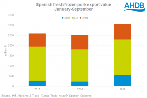 El valor de las exportaciones de carne de cerdo entre enero y septiembre de este año ascendió a 3.100 millones de euros, un 21% más en comparación con el mismo período en 2018.