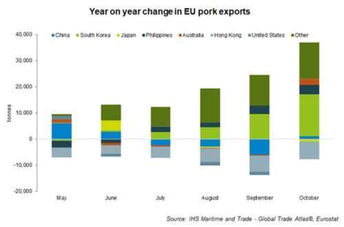 Los envíos de carne de cerdo de la UE a Corea del Sur superaron las 32.000 toneladas, 10.000 toneladas más que la cifra de septiembre y casi el doble del volumen que el exportado en octubre del pasado ejercicio. Esto representó un importante 15% en las exportaciones totales de la UE en el mes de octubre. Este crecimiento fue posible a pesar de que los Estados Unidos también exportaron más productos a Corea del Sur; los informes indican que el Grupo WH ha cambiado sus exportaciones de China a Corea del Sur a raíz de los aumentos de aranceles impuestos por China a la carne de cerdo estadounidense. No obstante, el análisis de Gira Foods sugiere que el nivel actual de las importaciones de Corea del Sur no se mantendrá en 2019.
