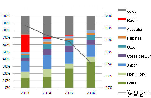 La demanda mundial de carne de porcino está en continuo crecimiento y la UE ha sido capaz de beneficiarse de una mayor demanda de importaciones, en particular de China. La expansión del mercado chino está relacionada en parte con el continuo crecimiento del consumo, pero también por el hecho que, a partir de 2015, muchas granjas de pequeño tamaño han abandonado su actividad debido a unos requisitos medioambientales más estrictos. Esta escasez de la oferta interna ha creado una mayor demanda de las importaciones y también un aumento de los precios de la carne de cerdo en China. Más de la mitad de las exportaciones de carne de porcino de la UE a China (61% como promedio en valor de exportación desde 2013) son las menudencias mientras que el resto son paletillas, panceta y otros cortes congelados.