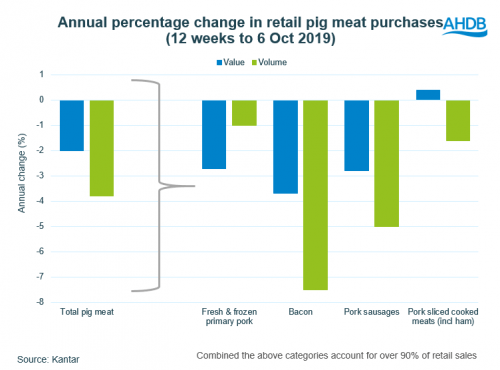 Durante las 12 semanas anteriores al 6 de octubre, las ventas minoristas de carne de cerdo en Reino Unido disminuyeron un 3,8% en volumen y un 2% en valor. La carne de cerdo no fue la única carne roja que registró descensos, acompañando a la baja las ventas de cordero, mientros los volúmenes de carne de vacuno permanecieron estables.