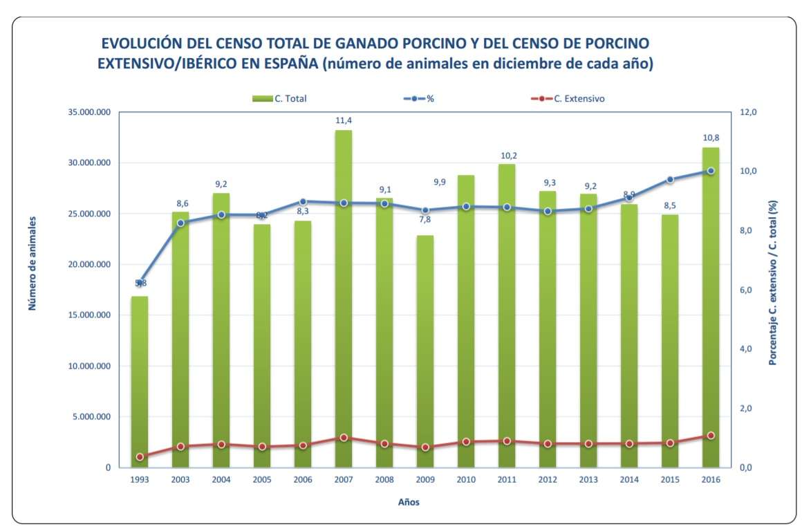 Los datos ofrecidos por el Ministerio de Agricultura recientemente muestran como el censo de porcino en España ha alcanzado en el año 2016 los 29,2 millones de animales, lo que significa un aumento del 15% en relación a 2009 cuando era de 25,4 millones y casi duplica el que contaba el país en el momento de la entrada en la Comunidad Económica Europea cuando era de 15,7 millones.
