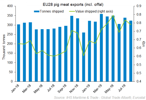 China continúa impulsando el crecimiento de las exportaciones de carne de cerdo, con un aumento del 60% en agosto, hasta un total de 169.000 toneladas. La situación de la PPA en China continúa impulsando la demanda, ya que los precios del cerdo han seguido aumentando durante todo el año. La producción de la UE también ha disminuido un poco en lo que va del año, lo que ha hecho que la situación del suministro sea más apretada. Esto ha ayudado a que el precio en Europa permanezca alto y el valor de las exportaciones aumente.