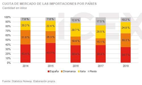 La mayor parte de estas importaciones provienen de España, uno de los países conocidos mundialmente como productor de jamón curado, al igual que Italia, pero, sorprendentemente, no es Italia el que ocupa el segundo puesto como proveedor de jamón curado en Noruega sino Dinamarca. España llega a ocupar una cuota de mercado de más del 40%, mientras que Dinamarca e Italia se reparten alrededor de otro 25% cada una. En conjunto, estas tres economías conforman aproximadamente el 90% de las importaciones de jamón de Noruega cada año.