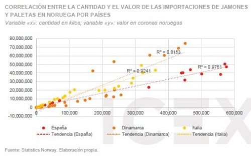 Los datos hasta ahora analizados ya arrojan algo de información sobre el precio del producto proveniente de cada país y su estrategia de precios, lo que nos lleva a realizar un estudio de correlación entre la cantidad de jamón curado importado en Noruega de cada país, como variable