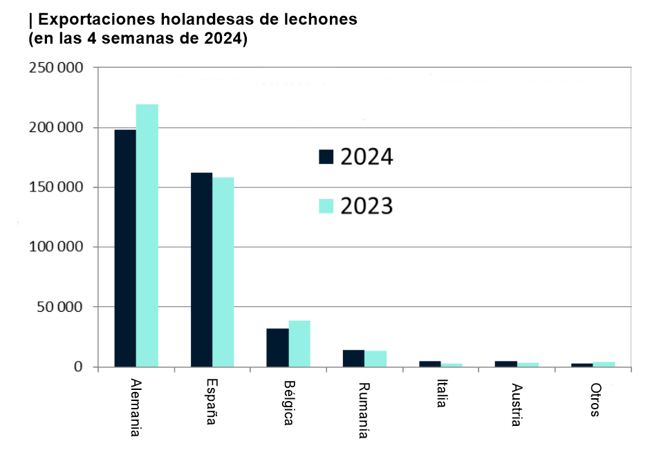 Las exportaciones holandesas de lechones durante las primeras 4 semanas de 2024 ascienden a 419.041 animales, un 4,8% menos, o casi 21.000 lechones menos que en el mismo período de 2023. El 47,2% de las exportaciones de lechones se destinaron a Alemania (197.873 animales), una reducción del 9,8%. Las exportaciones a España crecieron un 2,6%, con 162.394 lechones frente a loa 158.255 de 2023. Bélgica importó 31.991 lechones holandeses, un descenso del 17,8%. Estos 3 países representaron el 93,6% de las exportaciones holandesas de lechones durante los primeras 4 semanas de 2024.