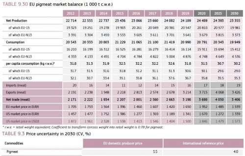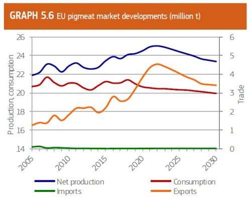 La producción de carne de cerdo de la UE está limitada por las opciones de política pública derivadas, en particular, de las preocupaciones ambientales en varios Estados miembros de la UE (por ejemplo, Alemania y los Países Bajos), y por el riesgo de PPA en Europa central y oriental. Sin embargo, el aumento actual de la demanda mundial y los precios permitirán el crecimiento en otros países, particularmente aquellos con acceso a los mercados asiáticos (por ejemplo, España). Una vez que la producción china comience a recuperarse, la producción y los precios de la UE deberían disminuir significativamente. Al final del período de perspectivas, se espera que la producción de la UE caiga a los niveles anteriores a 2018, ya que algunos consumidores no volverán del consumo de aves de corral al consumo de carne de cerdo.