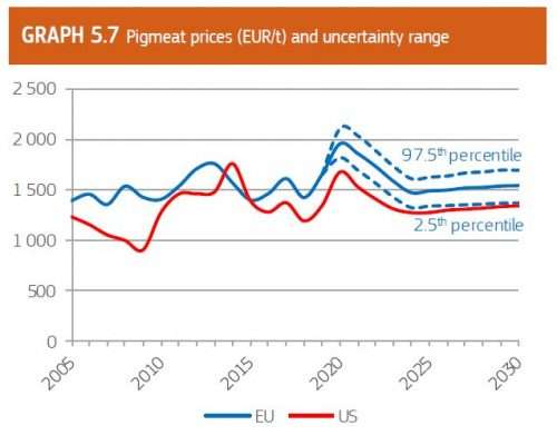 Los precios de la carne de cerdo de la UE ya están aumentando en 2019 a raíz de la demanda china, y aún deberían aumentar en 2020. Los precios deberían permanecer altos hasta que se recupere la producción china, y pueden caer bruscamente dependiendo de la velocidad de la recuperación y de la producción de los competidores de la UE (EE.UU., Brasil y Canadá). Una vez que la situación se estabilice, los precios de la UE deberían mantenerse en torno a 1.500€/Tn al final del período de perspectivas.