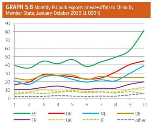 Las exportaciones de carne de cerdo de la UE ya han aumentado significativamente en 2019, impulsadas por la demanda china. Los envíos deberían mantenerse altos durante el período de las perspectivas, llegando a su punto máximo alrededor de 2022, y cayendo a medida que se recupere la oferta china. Sin embargo, se espera que las exportaciones de la UE sigan siendo más altas que hoy para 2030, ya que otros socios comerciales pueden no haber logrado recuperarse completamente de la PPA. Las principales incertidumbres para el período de perspectivas son el nivel de demanda china para entonces, y si la PPA se mantendrá fuera de los principales países exportadores de la UE. Las importaciones de carne de cerdo de la UE deberían seguir siendo muy bajas.