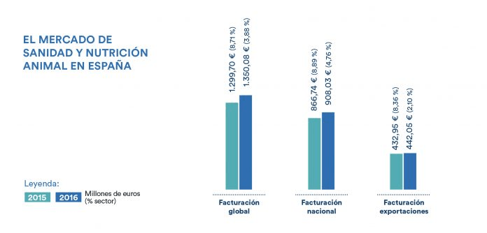 La industria española de sanidad y nutrición animal, a la que representa Veterindustria, creció con carácter general en 2016 un 3,88% con respecto al año anterior, lo que supone 1.350,08 millones de euros, de los cuales 908,03 millones son del mercado nacional con un crecimiento del 4,76%, y 442,05 millones de euros, el 2,10%, pertenecen a las exportaciones, las cuales representan un año más un tercio aproximado del mercado global del sector y aunque en 2016 han mantenido su crecimiento, éste se vio ralentizado.