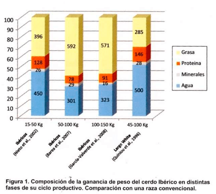 En la figura 1 aparecen las proporciones relativas de proteína y grasa depositadas durante los periodos de crecimiento y acabado del cerdo ibérico. Para la comparación, muestran también los del cerdo landrace X large-white. Independientemente de la fase de crecimiento considerada, la retención de la proteína corporal es menor, y la de la grasa es muy superior en el cerdo ibérico respecto a los datos que recoge la bibliografía sobre razas convencionales.