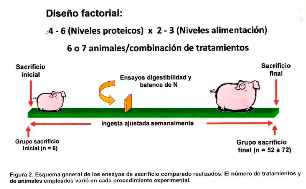 Las proteínas de las dietas empleadas en los ensayos las formularon siempre según el concepto de proteína ideal, entendida ésta como “el balance perfecto entre aminoácidos esenciales requerido para el mantenimiento y la producción”. Por otro lado, todos los ensayos los llevaron a cabo con cerdos ibéricos puros, machos castrados, de la estirpe Silvela.