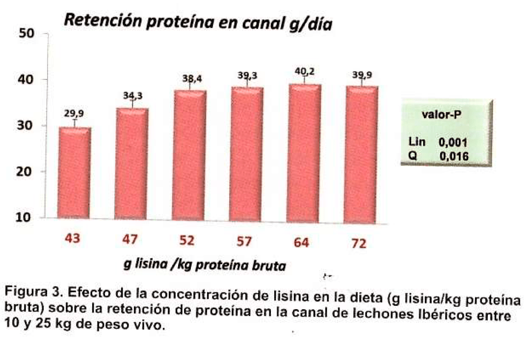 Las concentraciones finales de lisina empleadas fueron (g lisina/kg proteína bruta): 43, 47, 52, 57, 64 y 72. Cada tratamiento se ensayó en 10 lechones, que consumieron las dietas experimentales desde los 10 a los 25 kg de peso; en 6 de cada 10 por tratamiento se determinó la retención de nutrientes en la canal y los metabolitos plasmáticos. La retención de proteína en la canal aumentó de forma lineal y cuadrática a medida que se incrementaron los niveles de lisina en la dieta (Figura 3), alcanzando valores máximos (39,3-40,2 g/día) en las dietas que proporcionaron 57, 64 y 72 g lisina/kg proteína bruta. La estimación que proporciona la primera derivada de la función cuadrática que relaciona la retención de proteína en la canal y el nivel de lisina en la dieta nos sitúa el nivel de necesidades de lisina en 63,7 g por kg de proteína.