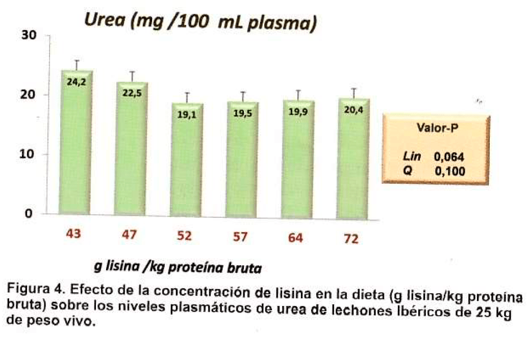 La concentración de urea plasmática tendió a disminuir a medida que se incrementaron los niveles plasmáticos de lisina, lo que indica una mejor utilización metabólica de la dieta, y por lo tanto menor excreción de nitrógeno en forma de urea.
