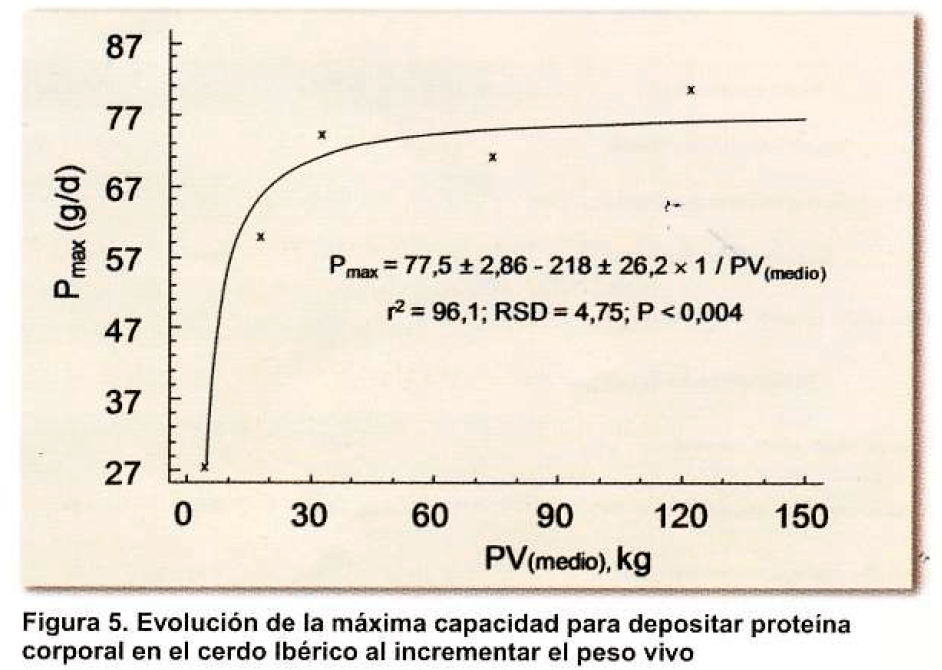 Para definir las necesidades proteicas del cerdo ibérico, analizaron la respuesta del animal en términos de velocidad de crecimiento y de deposición proteica a ingestas de proteínas variables, lo que implica la determinación de la máxima capacidad del animal para retener proteína (Pmax, g/día), y de respuesta en deposición de proteína a cambios en la ingesta energética. Este último concepto se denomina eficiencia marginal de deposición proteica y se expresa como el incremento en deposición de proteína (PR) por unidad de incremento en ingesta de energía metabolizable (IEM) (PR/IEM, g/MJ; 1MJ = 0,239 Mcal). Su determinación requiere que la alimentación sea restringida. Sobre ambos parámetros influyen el genotipo y el estatus endocrino, de manera que la relación óptima proteína/energía puede variar ampliamente entre razas dotadas de distinto potencial para formar proteína corporal.