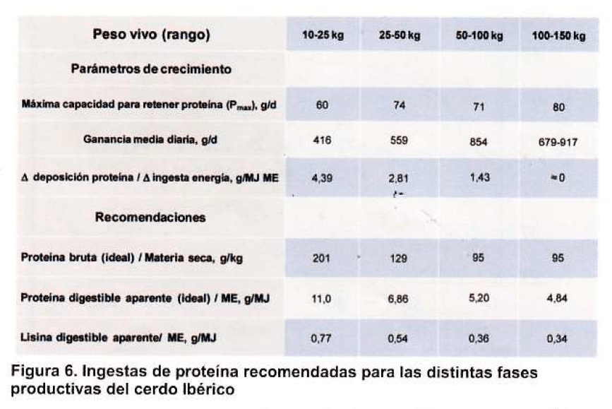 A la vista de las características descritas anteriormente, parece razonable que el cerdo ibérico deba recibir una alimentación proteica diferenciada respecto a la establecida para los genotipos porcinos convencionales o magros, los cuales se ajuste a esta baja capacidad de retención de proteína corporal.
