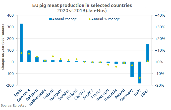Esto está en marcado contraste con Alemania, cuyo mercados se encuentra acosado por los problemas de la Peste Porcina Africana (PPA) en su población de jabalíes y las limitaciones de capacidad de procesamiento relacionadas con la Covid-19, el sacrificio cayó un 6% (310.000 cabezas) respecto al año anterior en noviembre. La producción en Alemania cayó casi un 3% (128.000 toneladas) en el año hasta noviembre. Italia ha experimentado caídas aún más severas, con una producción en el año hasta noviembre, cayendo casi un 14% (180.000 toneladas).