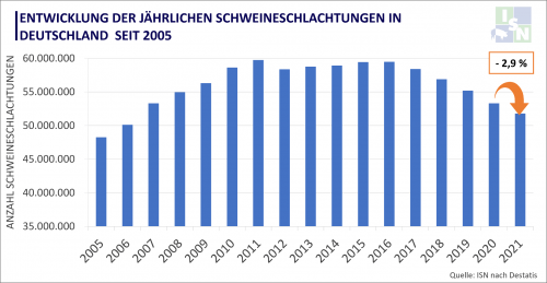 Con 51,8 millones de animales sacrificados en 2021, el número de cerdos sacrificados cayó un 2,9% en comparación con el año anterior. El número de cerdos de origen nacional sacrificados cayó un 0,8%, hasta los 50,6 millones de animales, mientras que el número de sacrificios de cerdos importados cayó un 49%, hasta los 1,2 millones de animales.