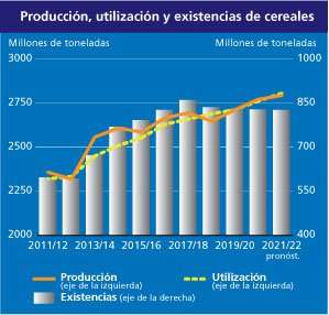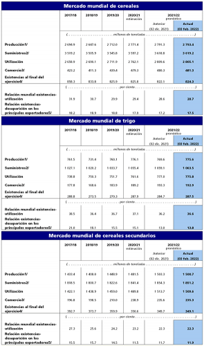 Se estima que la utilización mundial de cereales en 2021/22, cifrada en 2.805 millones de toneladas, aumentará en un 1,6% respecto del nivel de 2020/21, pese a una revisión a la baja de 4,5 millones de toneladas desde diciembre, efectuada casi exclusivamente en relación con el uso como pienso. El hecho de que la utilización de trigo como pienso haya sido inferior a lo estimado anteriormente en EE.UU., a raíz de su precio elevado frente a otros cereales forrajeros, y en Argentina, como resultado de unas exportaciones superiores a lo previsto, explica la mayor parte de la revisión a la baja de 1,2 millones de toneladas que se realizó este mes respecto a la utilización mundial de trigo en 2021/22, que ahora se estima en 776 millones de toneladas, cifra que sigue situándose un 1,9% por encima del nivel de 2020/21. Del mismo modo, pese a una reducción de 4,1 millones de toneladas atribuida en gran medida a las estimaciones de una disminución del uso de maíz como pienso desde diciembre, sigue estimándose que la utilización mundial de cereales secundarios aumentará en un 1,3% en 2021/22.