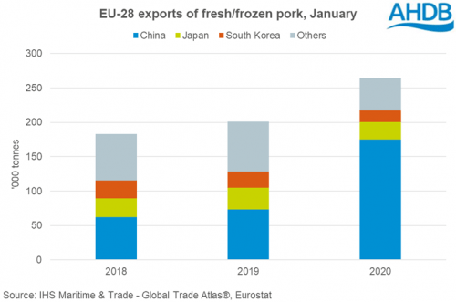 Si bien, los envíos a China siguieron siendo significativos, los volúmenes absolutos estuvieron por debajo del pico registrado en octubre y noviembre de 2019. El crecimiento interanual también ha retrocedido un poco; debido a los volúmenes más que triplicados en el cuarto trimestre de 2019, respecto a los niveles de 2018. La liberación de las existencias estatales chinas de carne de cerdo y los altos volúmenes de importación en los meses anteriores significaron que la demanda de importación china disminuyó en el durante la festividad de Año Nuevo. La epidemia de coronavirus también afectó posteriormente las importaciones, aunque los informes sugieren que el comercio ha comenzado a moverse nuevamente en las últimas semanas.