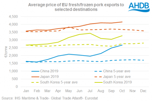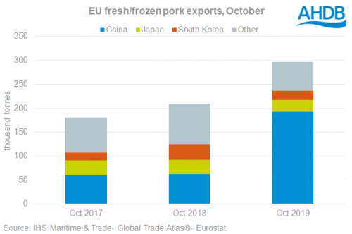 El crecimiento interanual de las exportaciones de carne de cerdo de la UE, que ha sido evidente a lo largo de 2019, continuó en octubre.