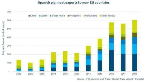 Las exportaciones de carne de cerdo a la UE disminuyeron un 2%, en 1,1 millones de toneladas en 2018. Las exportaciones a destinos fuera de la UE aumentaron un 7,5%, en 600.000 toneladas. Los exportadores españoles han tenido mucho éxito en el crecimiento de sus volúmenes de exportación adicionales de la UE en los últimos años, lo que ha respaldado la expansión de la producción nacional. Las exportaciones fuera de la UE representaron el 20% del volumen total de exportaciones hace cinco años, pero en 2018 contribuyeron con más de un tercio.