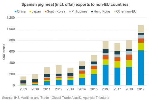 Los informes sugieren que a pesar del gran déficit de carne de China, el brote de coronavirus en el país está interrumpiendo los envíos de carne y ralentizando los pedidos. Como resultado, las existencias congeladas españolas están creciendo a la espera de que se reanude el comercio chino. España ya es un gran exportador neto de productos de carne de cerdo. Con el consumo interno inactivo, necesita un fuerte mercado de exportación para gestionar sus crecientes suministros. Sin embargo, este año el éxito de esto estará influenciado por el manejo de la PPA y el coronavirus (tanto en China como en Europa), y la competencia de la carne de cerdo estadounidense más barata en China después de los acuerdos comerciales.