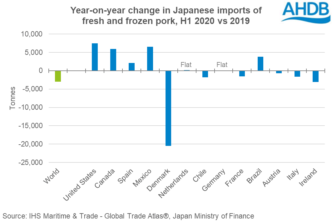 Los volúmenes de carne de cerdo fresca y congelada de proveedores claves, incluidos EE.UU., Canadá, España y México, aumentaron durante el año. Sin embargo, una continua disminución de las importaciones de Dinamarca han compensado este crecimiento. También han caído los volúmenes de proveedores más pequeños como Chile, Francia e Irlanda, aunque en menor medida.