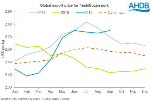 Los precios aumentaron bruscamente en marzo y abril cuando el impacto de la PPA comenzó a impulsar la demanda de importaciones en China. Los suministros mundiales se han reducido debido a la caída de la producción china, y esto también ha impulsado la demanda de carne de cerdo comercializada internacionalmente.