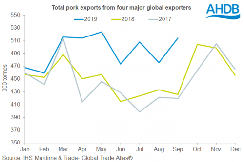 Los exportadores de la UE son los principales comerciantes que ven el beneficio de los precios más altos. Actualmente, la UE está mejor ubicada para abastecer el principal mercado demandante de importaciones. En el tercer trimestre de este año, las exportaciones de carne de cerdo de la UE promediaron 2,90$/kg, un 15% más que el año pasado. La UE es normalmente el exportador con el precio más alto, pero en septiembre, era notablemente un 9% superior al promedio mundial. Esto podría no ser sostenible si el acceso de EE.UU. a China mejorara, particularmente porque Canadá ahora puede suministrar a China nuevamente.