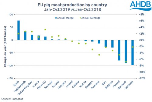 Solo unos pocos países han informado de cifras de noviembre hasta ahora, que representan aproximadamente un tercio del total de la UE. Las cifras iniciales sugieren que los suministros se apretaron nuevamente en noviembre; los países involucrados registraron unos sacrificios aproximadamente 5% menor respecto al año anterior. Por ejemplo, los sacrificios disminuyeron un 7% en Dinamarca y un 6% en Francia. Por supuesto, los sacrificios en Alemania y España, que aún no se han informado, influirán significativamente en la tendencia general.