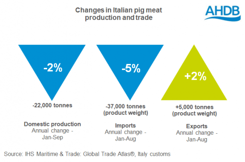 La producción nacional de carne de cerdo en Italia ha disminuido durante el año y hasta septiembre en un 2% (-22.000 toneladas) en comparación con el año anterior. La disminución anual fue particularmente marcada en el tercer trimestre, cuando los volúmenes fueron un 4% más bajos.