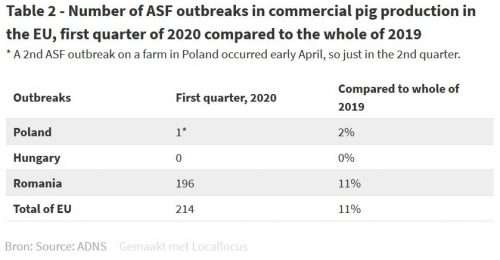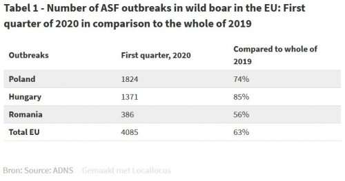 En el primer trimestre de 2020, en toda la Unión Europea, se encontraron 4.085 jabalíes infectados. Esto es aproximadamente igual al 60% que se encontró en todo 2019. Los porcentajes de Polonia y Hungría incluso alcanzan más del 70% de la cantidad total de animales encontrados en 2019. En Rumania, ese porcentaje supera el 50%.
