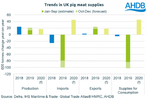 La fuerte caída de las importaciones, significa que los suministros disponibles para el consumo en el mercado interno han sido notablemente más bajos este año que el pasado año 2018. Sin embargo, la demanda interna también ha estado cayendo, lo que limita la presión al alza sobre los precios del cerdo. Los suministros pueden recuperarse un poco en 2020, pero seguirán siendo bajos según los históricos. La demanda en el mercado interno contrasta fuertemente con el mercado de exportación en la actualidad, lo que significa que compiten cada vez más con mercados comunitarios por los mismos tipos de productos y mercados de destino. Esto puede ayudar a mantener los precios, pero también corre el riesgo de reducir aún más el mercado del Reino Unido.
