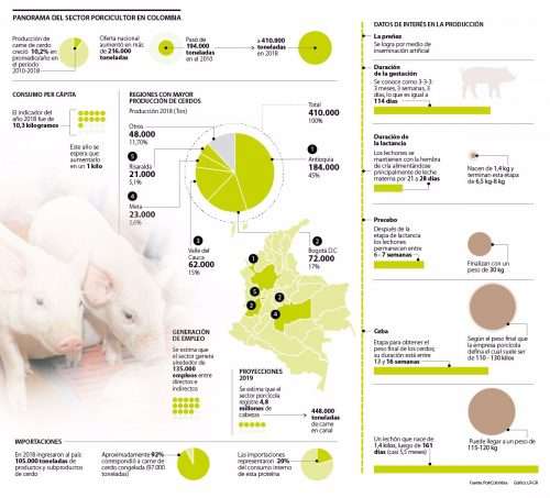 La producción de carne de cerdo en Colombia creció un 10,2% en promedio/año en el periodo 2010-2018. En ese periodo, la oferta nacional aumentó en más de 216.000 toneladas, al pasar de 194.000 toneladas en 2010, a 410.000 toneladas en 2018.