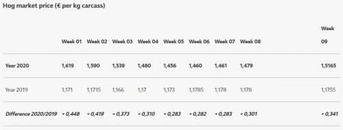 El precio medio de mercado fue de 1,511€/kg de canal para los meses de enero y febrero de 2020, en comparación con los 1,1735€/kg para el mismo período del pasado año, una diferencia de aproximadamente 32€/Cerdo.