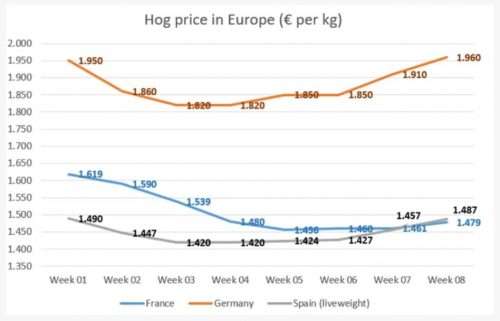 Francia y el resto de Europa se benefician actualmente de una tendencia al alza, aunque el mercado está más saturado tras la actual epidemia de coronavirus que se está extendiendo en todo el mundo (130 personas infectadas en Francia a fecha 2 de marzo de 2020). Esto complica la logística hacia Asia y China, cuya demanda de carne de cerdo sigue siendo importante, pero también está llena de incertidumbres, como el mercado italiano, muy afectado por el COVID-19.