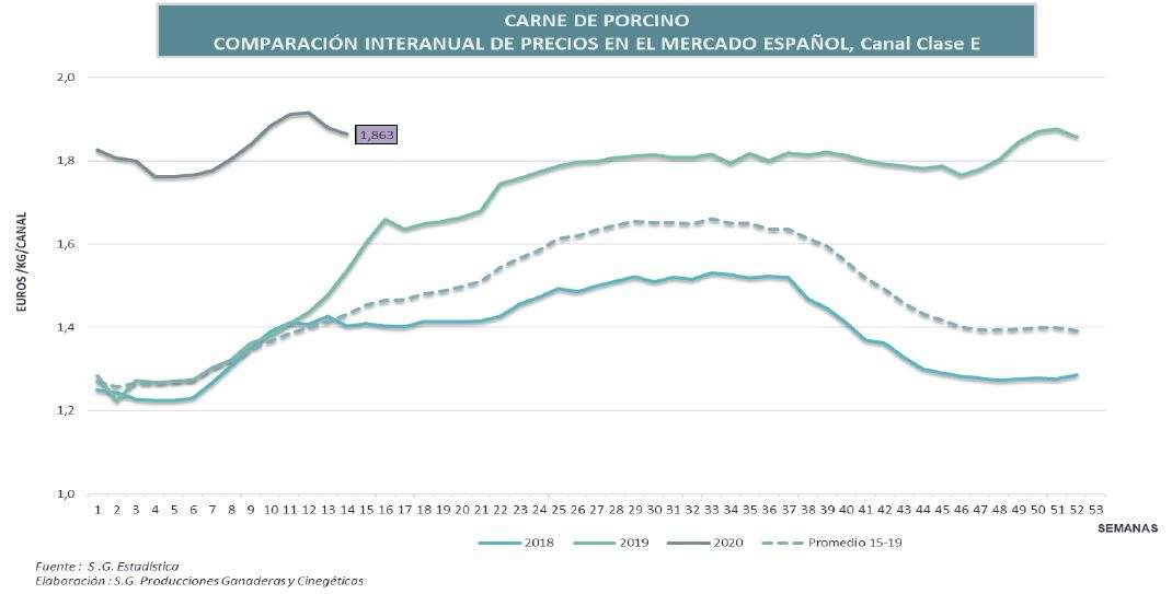 - Precio nacional de carne de porcino en canal E: Evolución positiva del +2,66% con respecto al trimestre anterior, y del +24,30% con respecto a la misma semana del ejercicio 2019, presentando en la semana 13 de 2020 un precio de 186,30€/100kg.