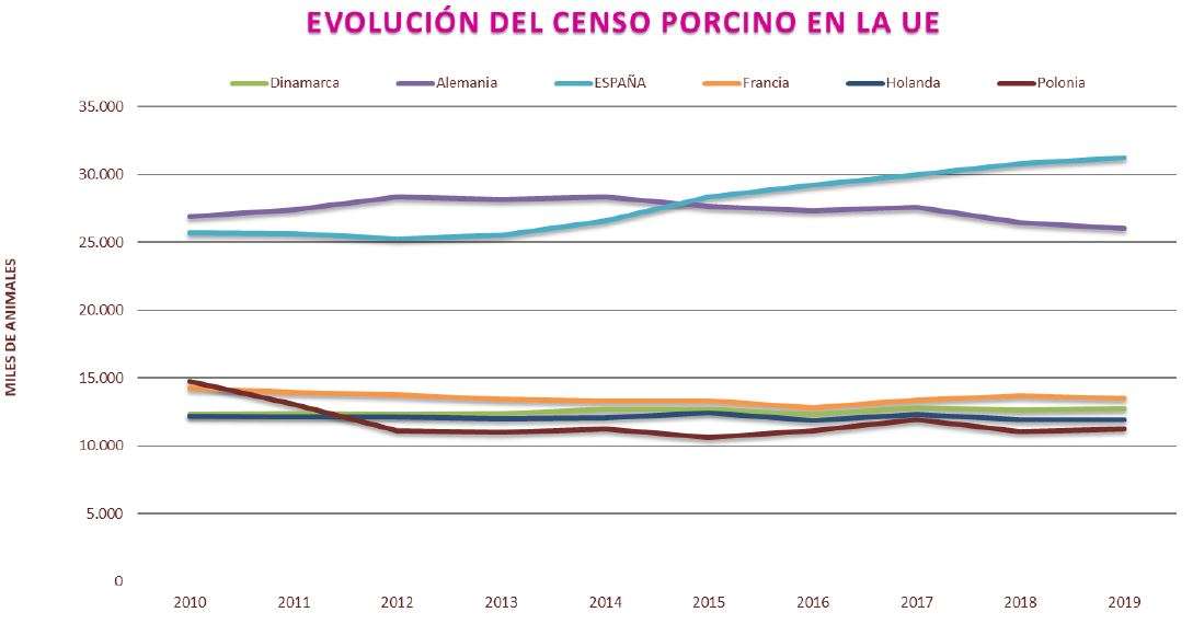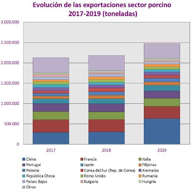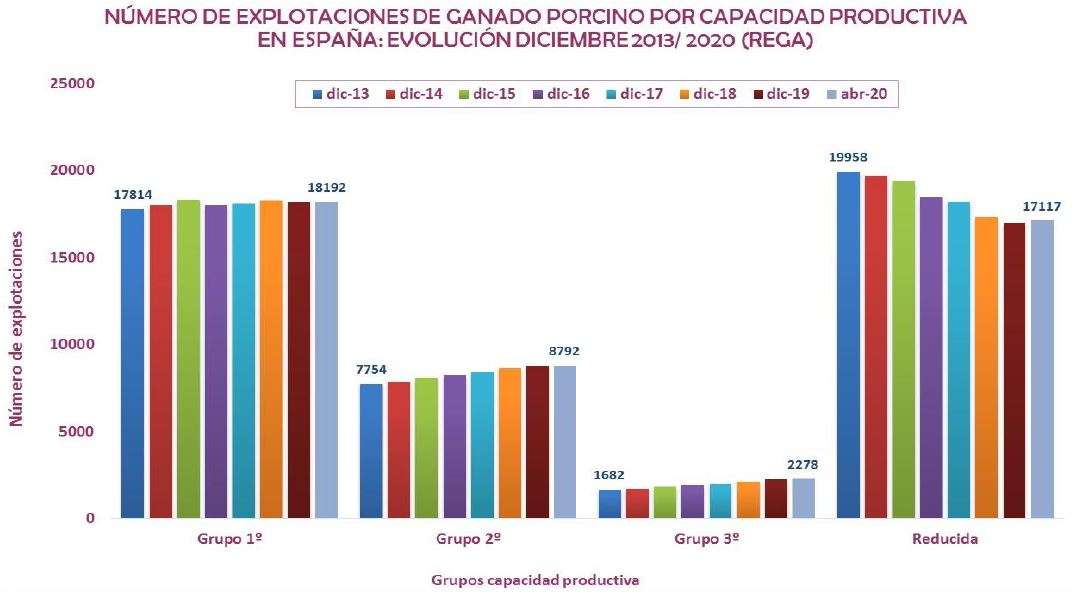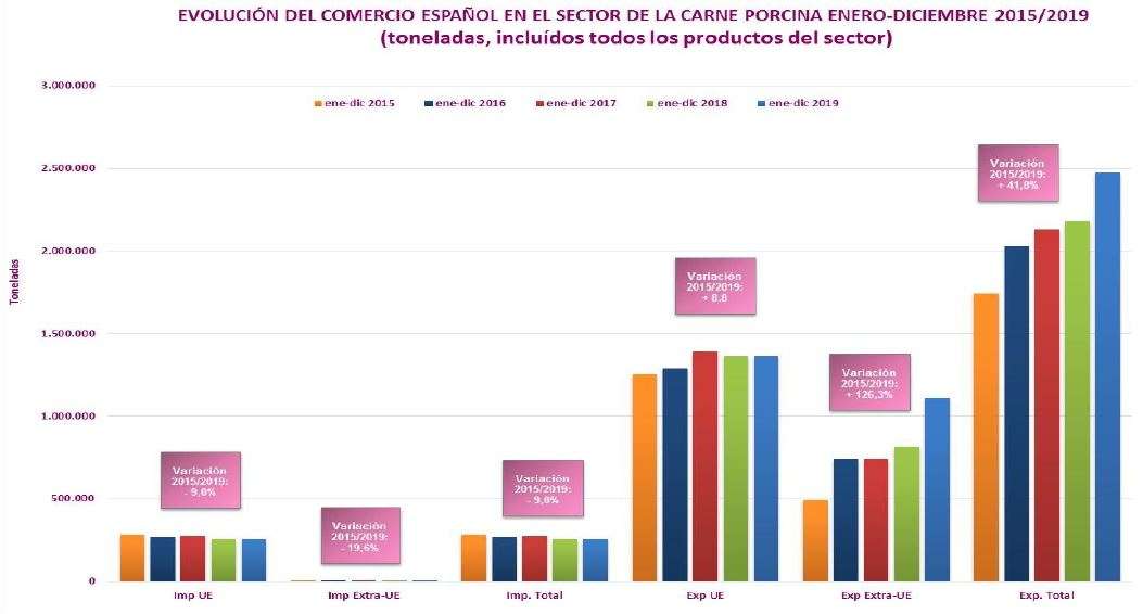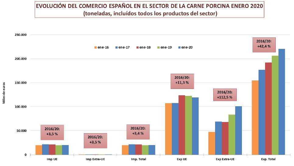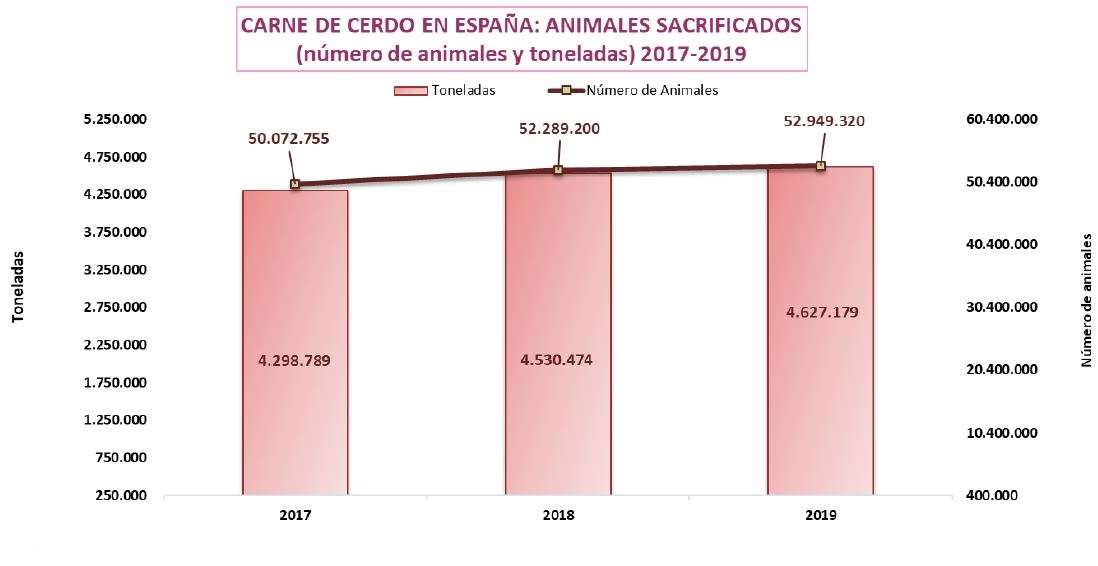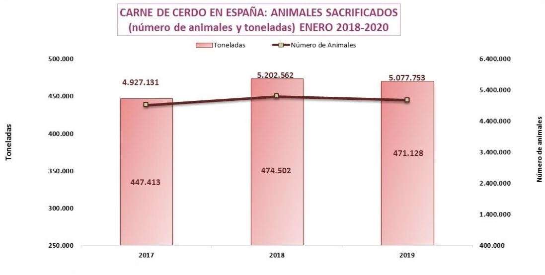 - Producción de carne: Con más de 52 millones de cerdos sacrificados en 2019, presentan una evolución positiva del +2,13% en toneladas de carne y del +1,26% en número de animales respecto al periodo 2018 – 2019. Con más de 5 millones de cerdos sacrificados en el mes de enero de 2020, representa un disminución de -0,70% de toneladas de carne de cerdo y -2,30% en el número de animales respecto al mismo mes de 2019.
